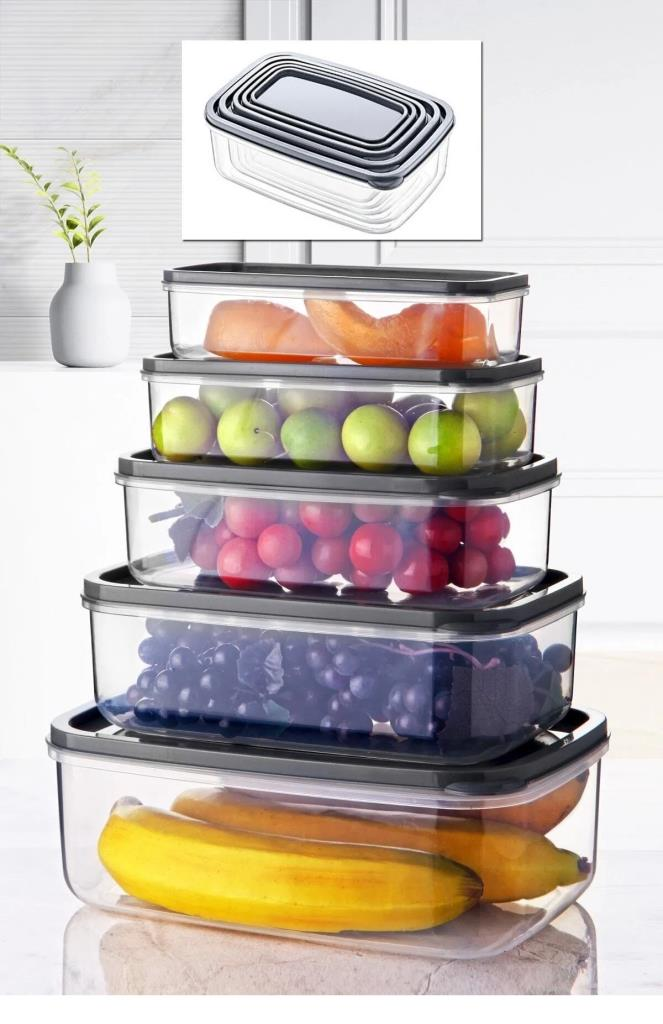 Ürünümüz yüksek performanslı sert plastikten üretilmiştir. Kanserojen madde içermez. Erzak, bakliyat yanı sıra kuruyemiş ve cipslerinizi de muhafaza edebilirsiniz. Sebze, meyve ve her türlü gıdanızı saklayabilirsiniz. Ürünümüzü kullanmadığınız zamanlarda iç içe istifleyebilirsiniz. Darbelere karşı dayanıklıdır. Gıda temasına uygundur. Bpa içermez, sağlığa zarar vermez. Kırılmaz ve esnek yapıya sahiptir. Kolay temizlenir. Paket içeriği : 1 Adet 2100 ML 2100 ML Ölçü: En:22 cm x Boy:15 cm x Yükseklik:8 cm 1 Adet 1300 ML 1300 ML Ölçü: En:20 cm x Boy: 12,5 cm x Yükseklik:6,5 cm 1 Adet 850 ML 850 ML Ölçü: En:18 cm x Boy:10,5 cm x Yükseklik:5,5 cm 1 Adet 530 ML 530 ML Ölçü: En:16,5 cm x Boy:8,5 cm x Yükseklik:4,5 cm 1 Adet 330 ML 330 ML Ölçü: En:14,5 cm x Boy:7 cm x Yükseklik:4 cm