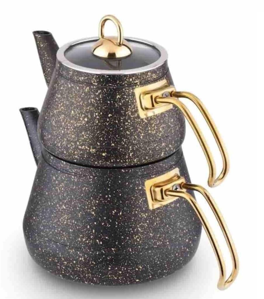 Lines Maya Granit Çaydanlık Takımı Orta Boy Altın Kulp Siyah